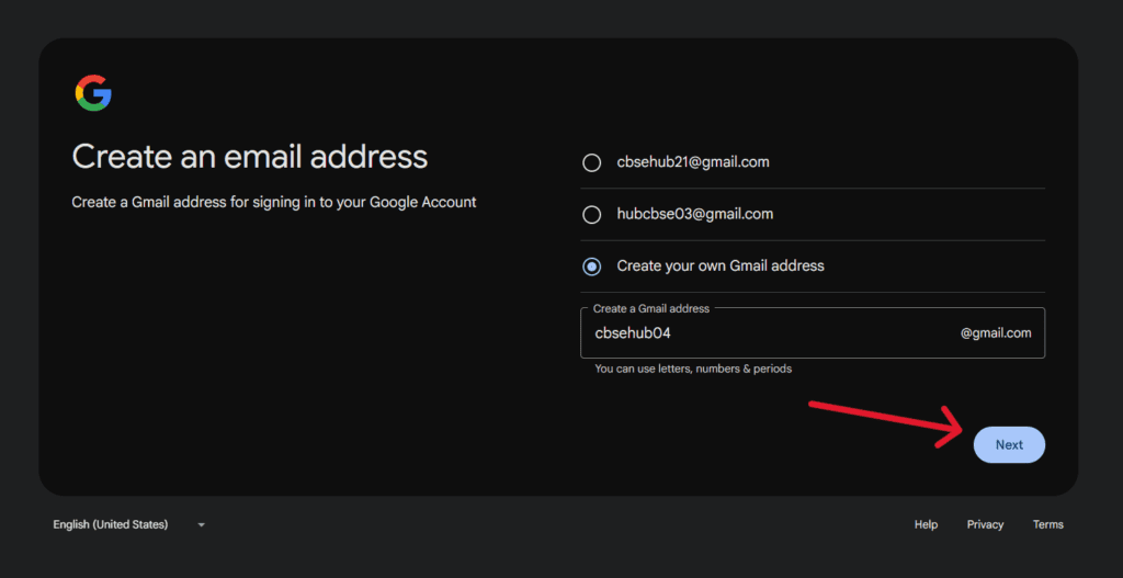 If your name is already taken, Google will suggest other options.